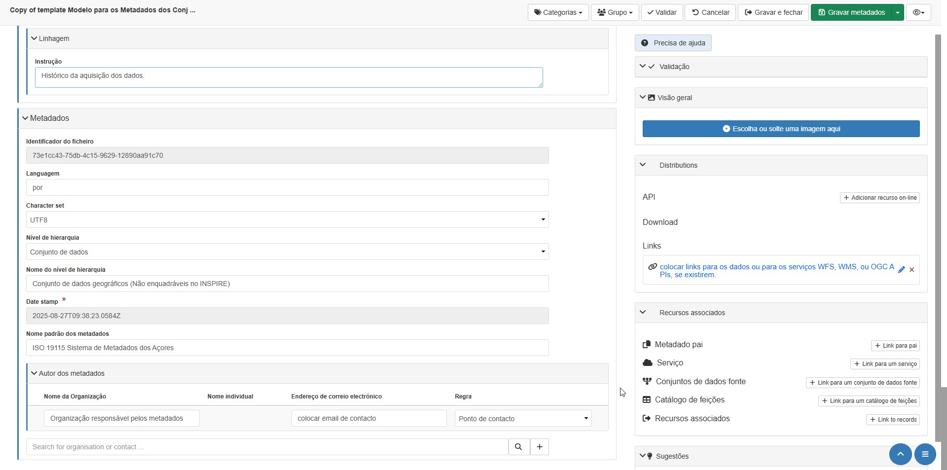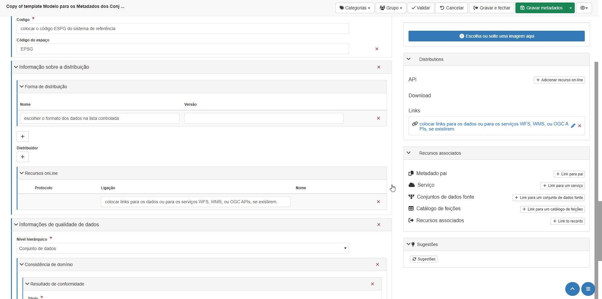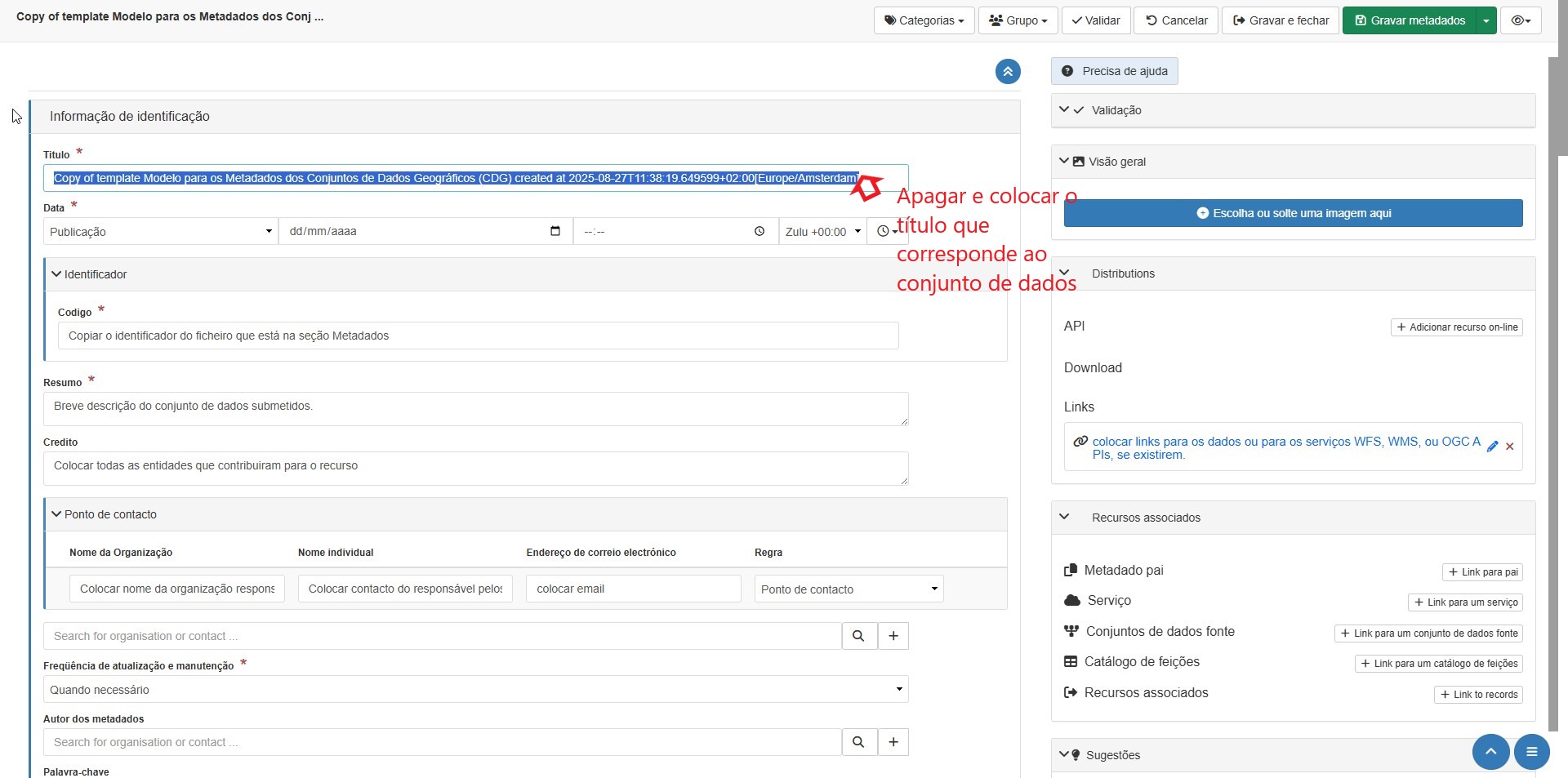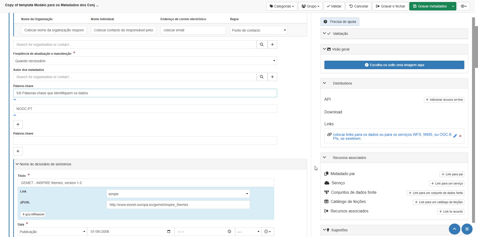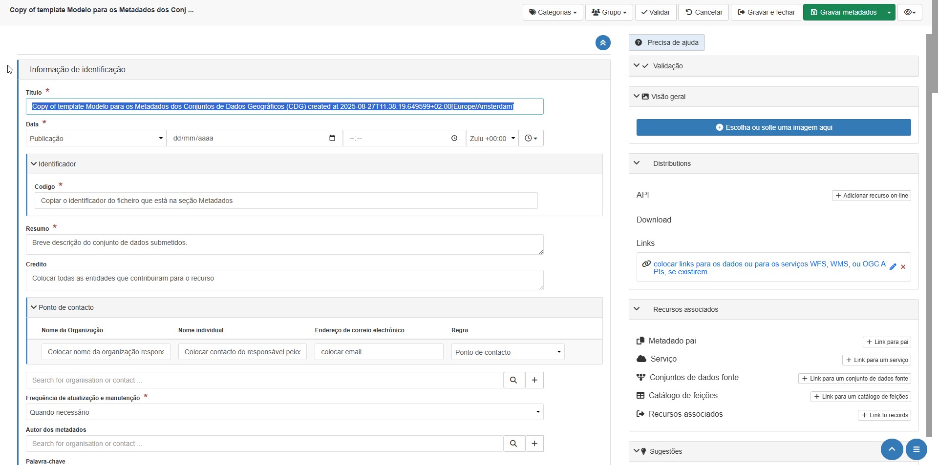 O modelo de metadados contém diversos campos com instruções breves sobre o tipo de informação a ser inserida em cada um deles (como "Escreva nome de contacto", "Coloque a data", etc.). Essas instruções servem apenas como orientação e devem ser apagadas no momento do preenchimento, sendo substituídas pela informação real e correspondente ao Conjunto de Dados Geográficos (CDG) que será submetido.