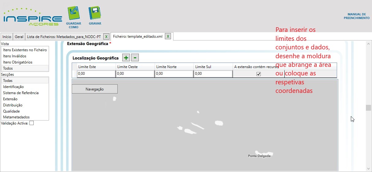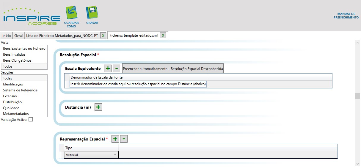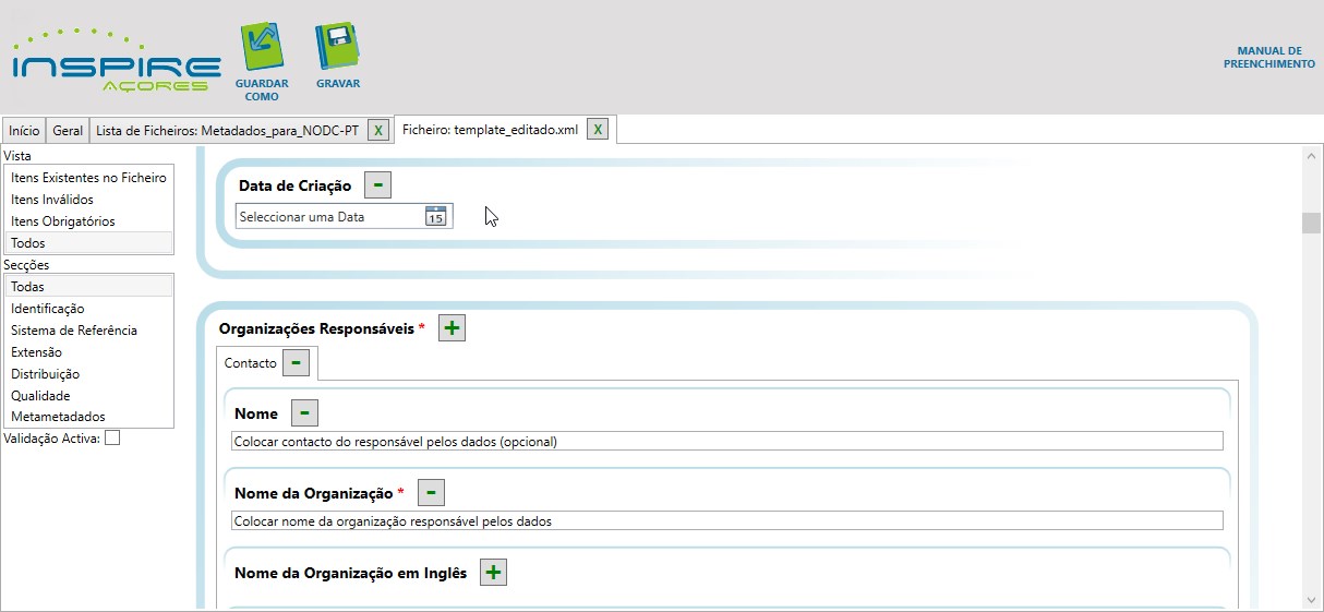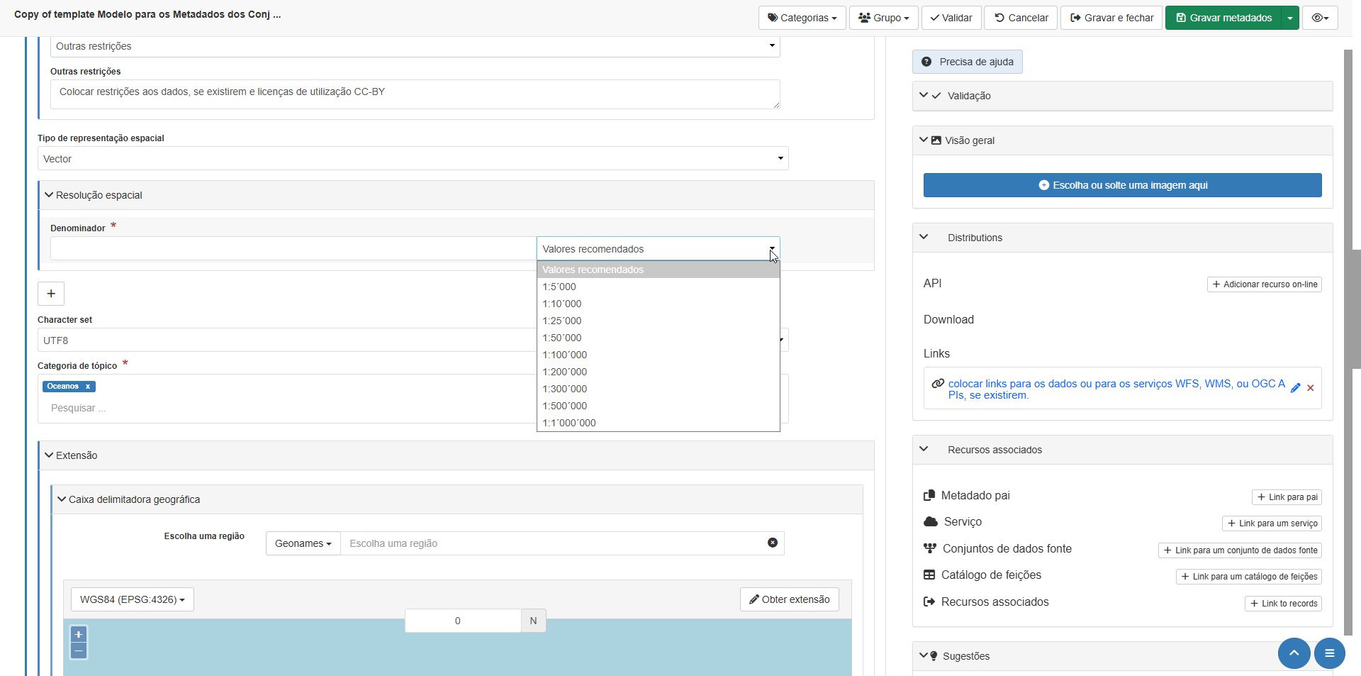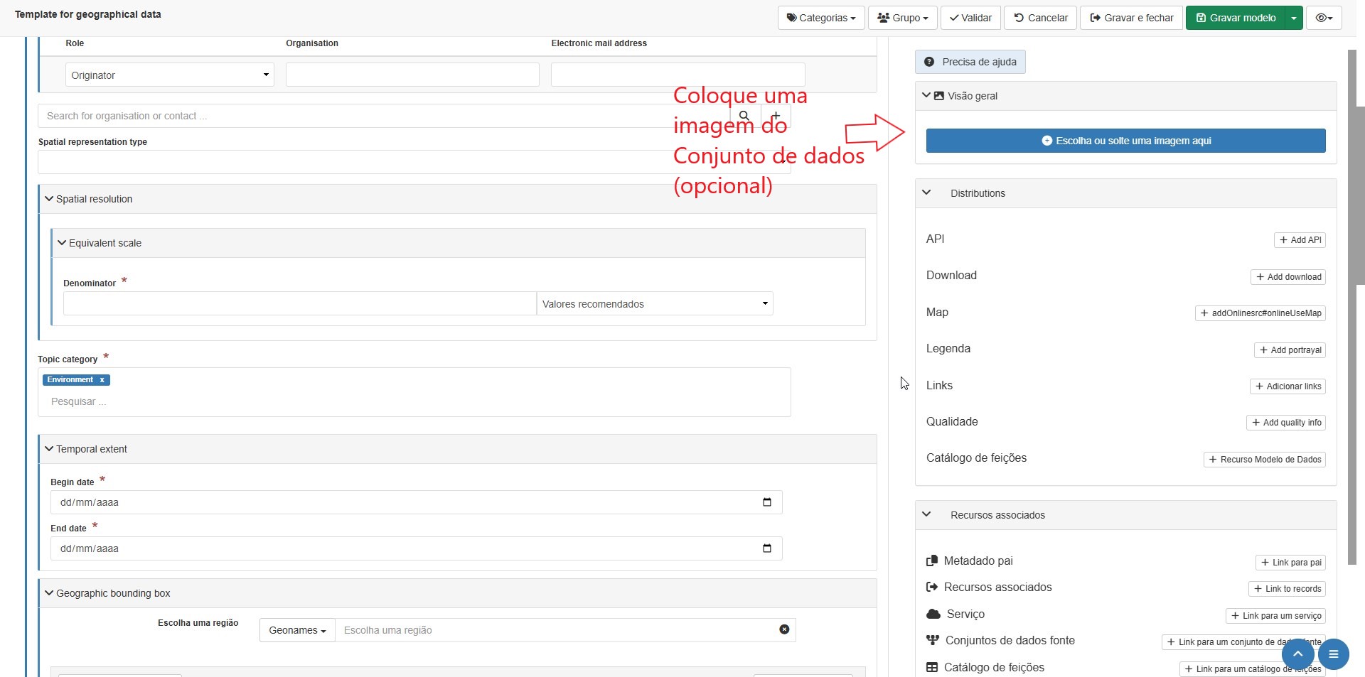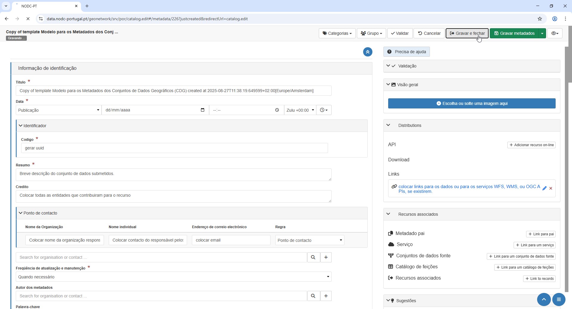 O modelo de metadados contém diversos campos com instruções breves sobre o tipo de informação a ser inserida em cada um deles (como "Escreva nome de contacto", "Coloque a data", etc.). Essas instruções servem apenas como orientação e devem ser apagadas no momento do preenchimento, sendo substituídas pela informação real e correspondente ao Conjunto de Dados Geográficos (CDG) que será submetido.