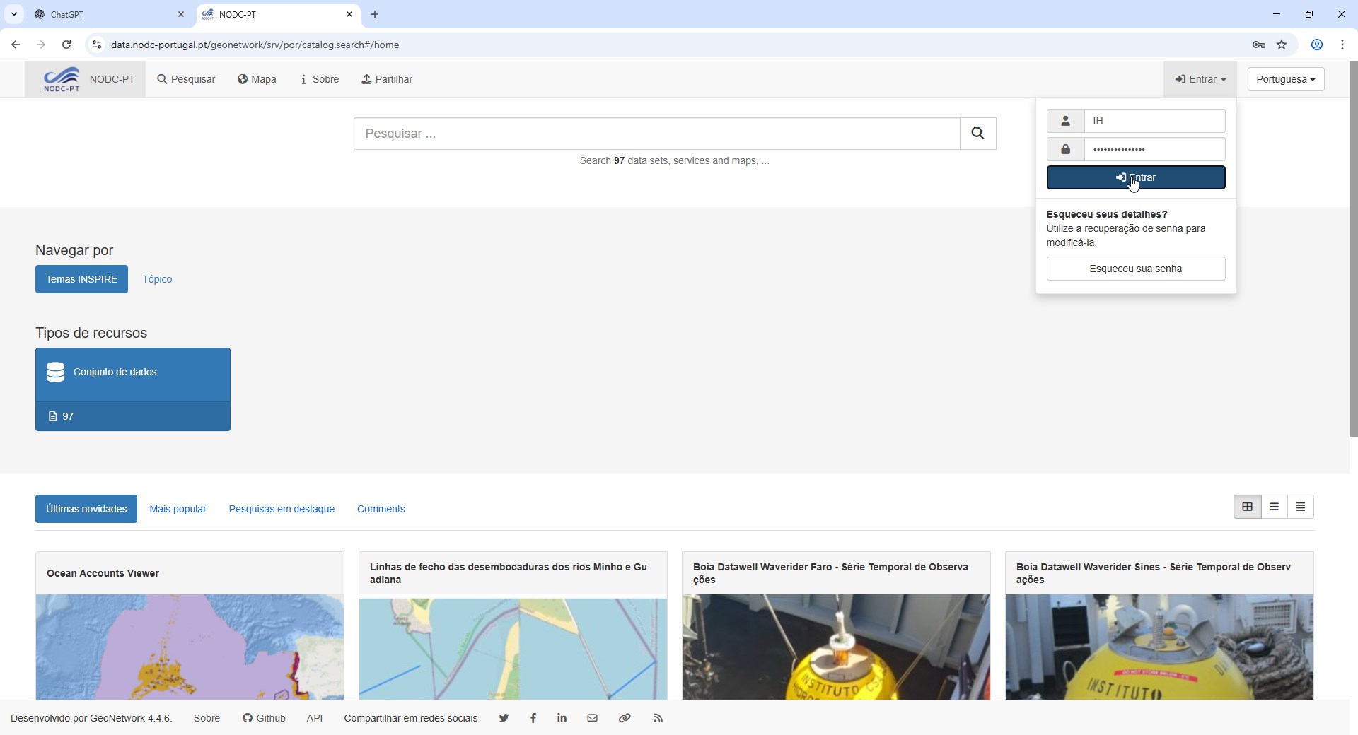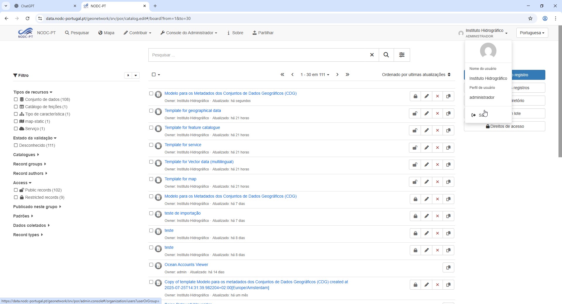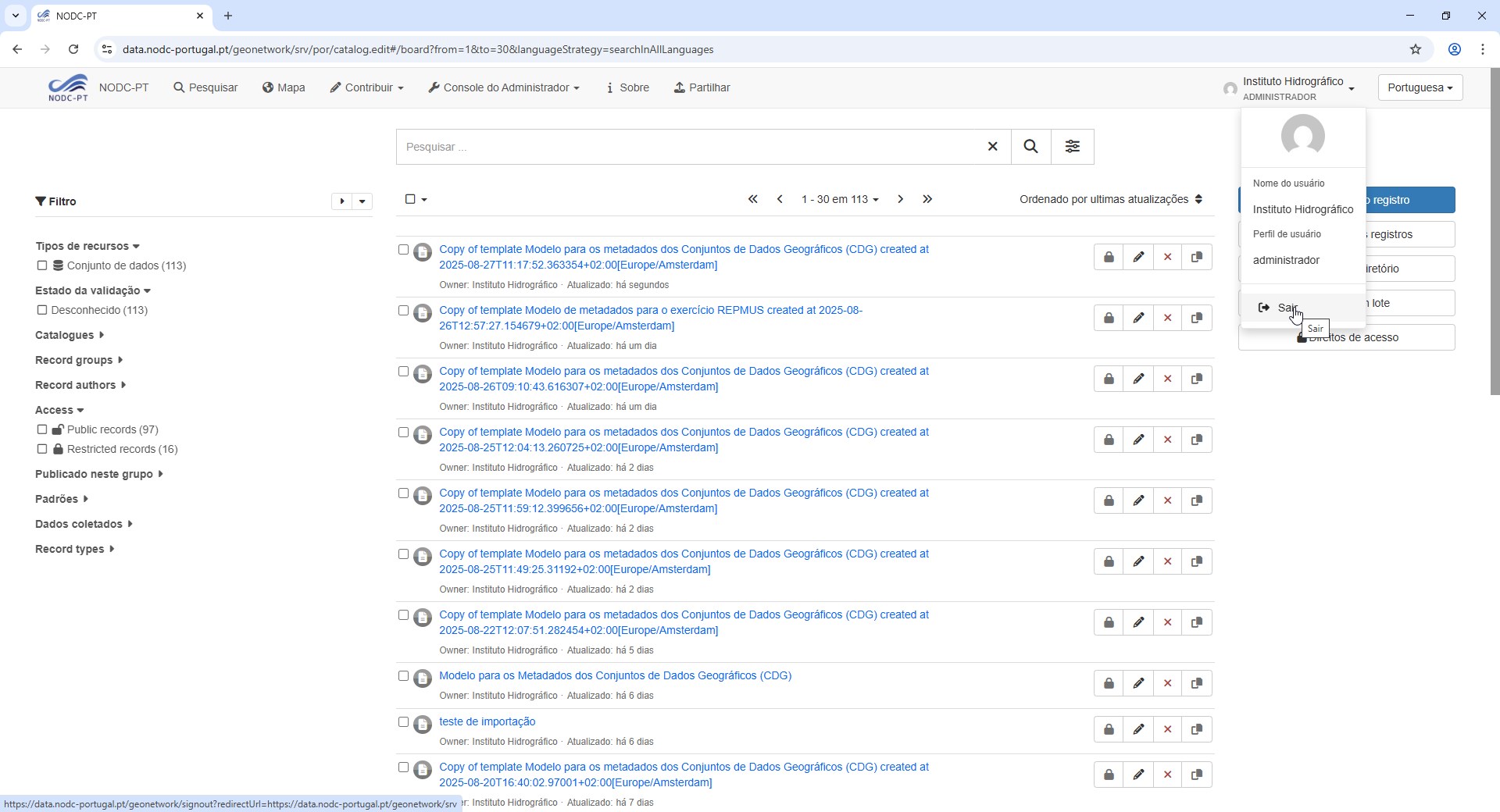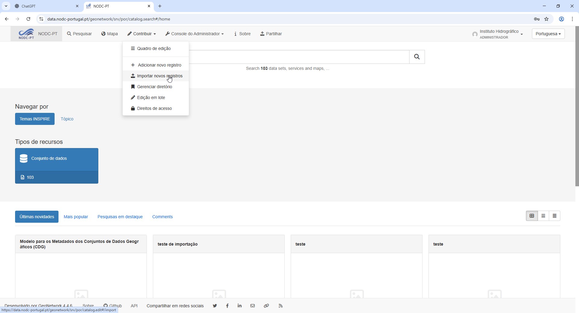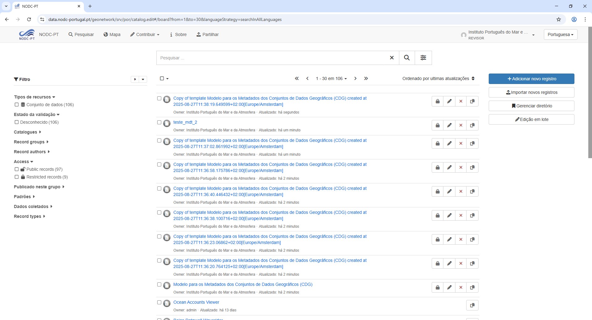 Aceda ao Catálogo de Metadados do NODC-PT com as credenciais apropriadas. Em seguida, localize e importe o ficheiro XML de metadados criado no GeMA.
