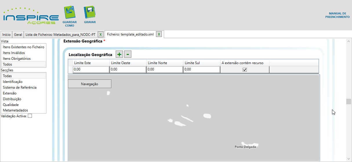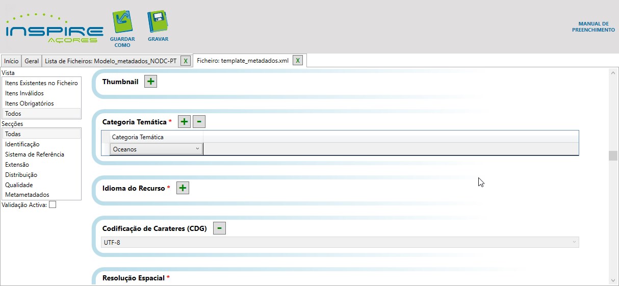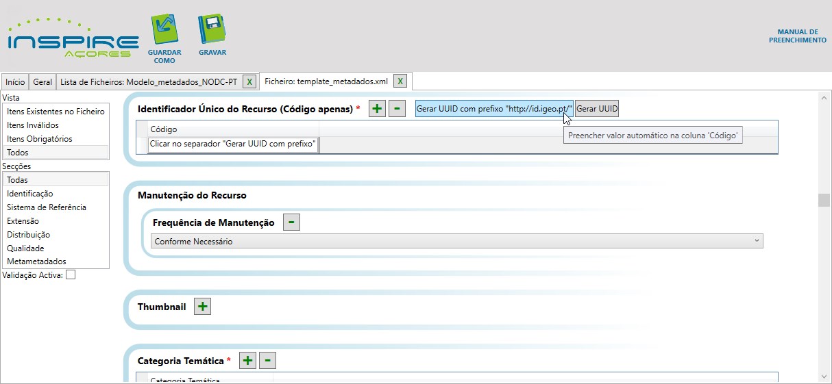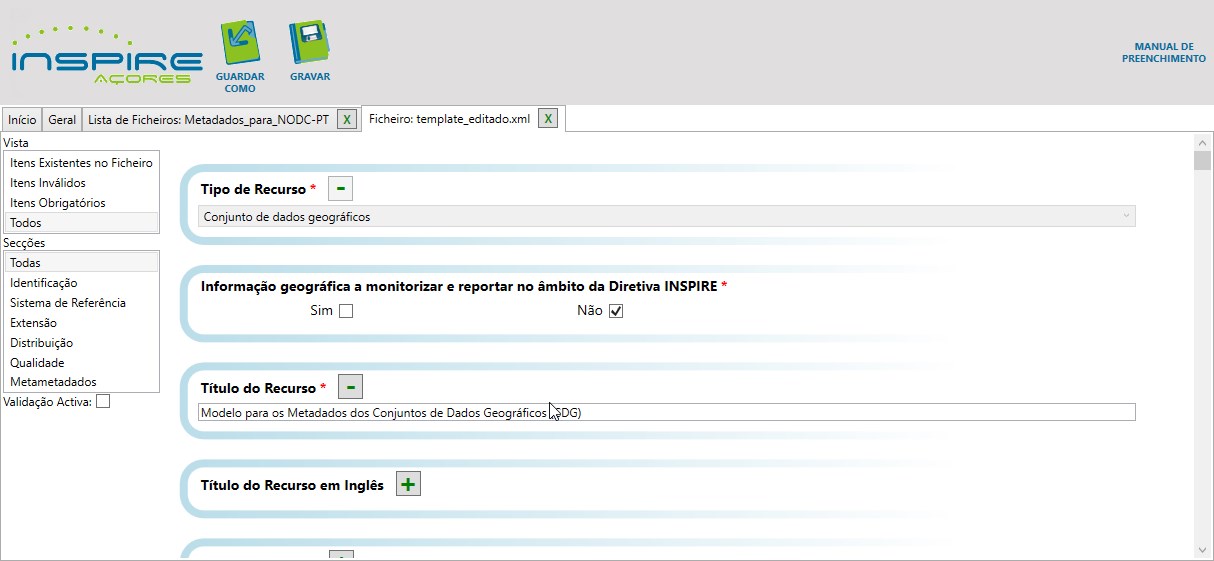 Em ambos os processos, a criação dos metadados baseia-se num template em formato XML (Extensible Markup Language), denominado Modelo para os Metadados dos Conjuntos de Dados Geográficos (CDG)" (template_metadados.xml). Este modelo (disponível aqui) define os campos mínimos obrigatórios para a identificação dos CDG, permitindo ainda a inclusão de campos adicionais conforme as necessidades específicas de cada entidade.