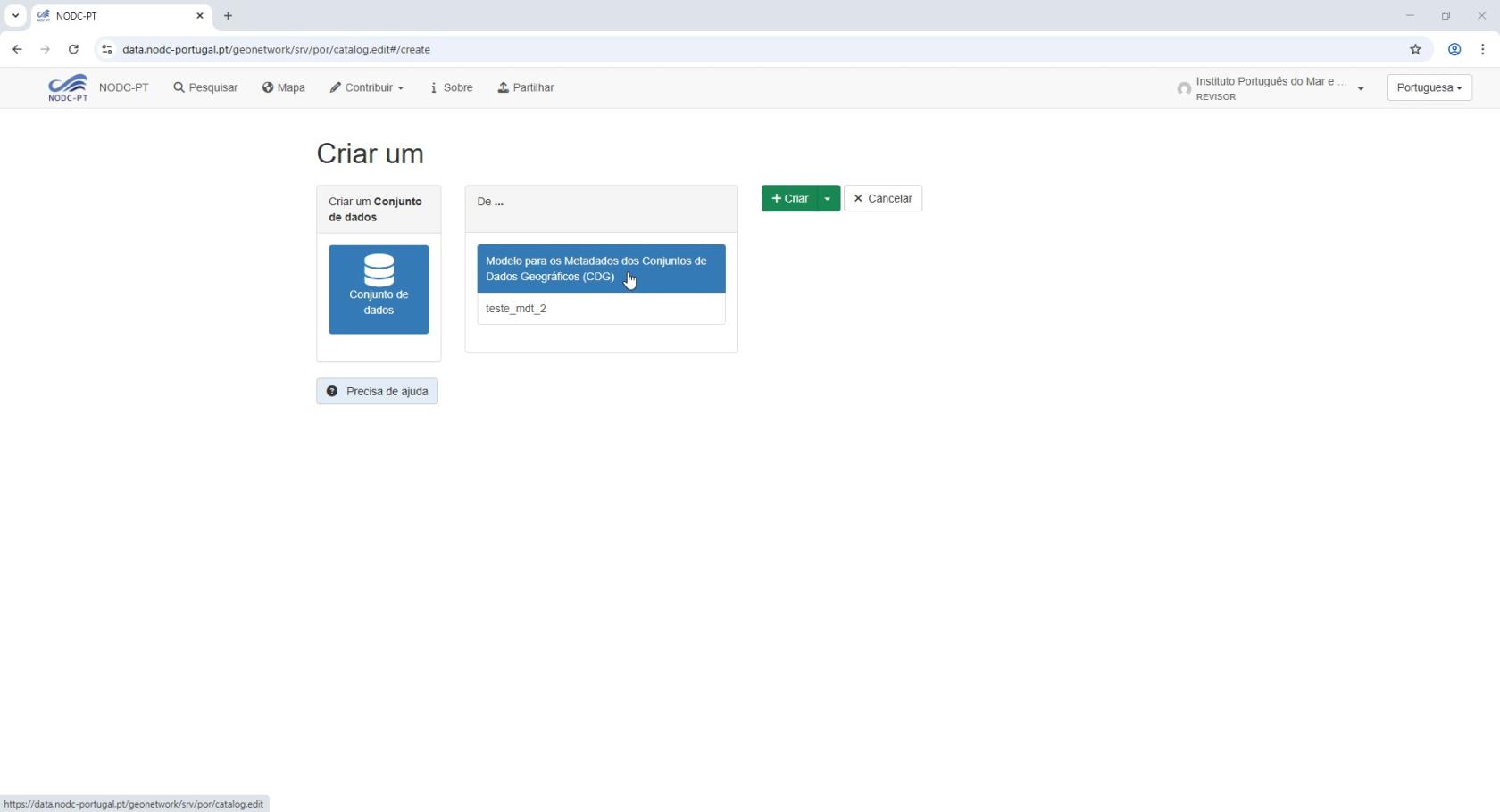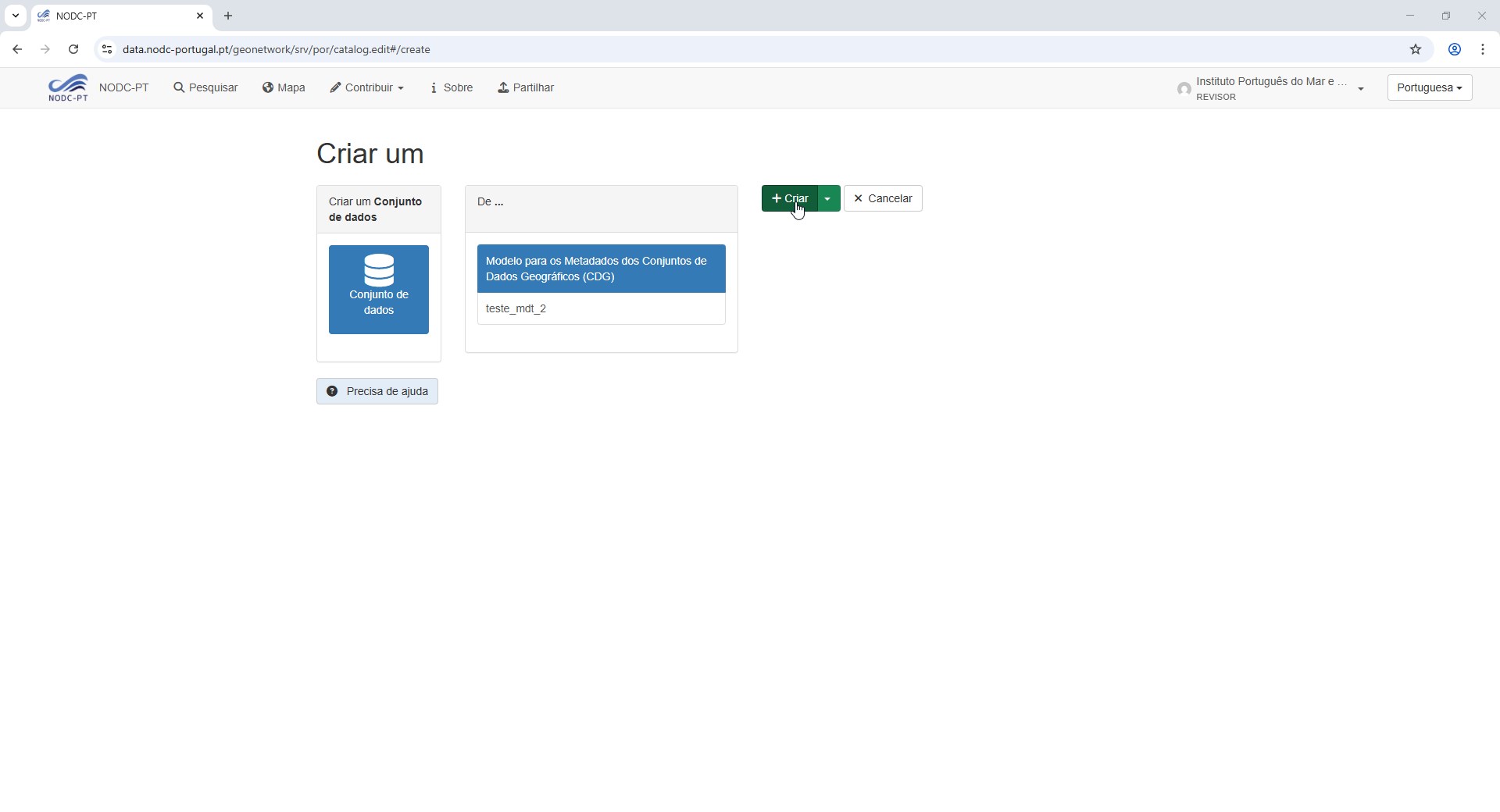 A criação de fichas de metadados diretamente no Catálogo de Metadados do NODC-PT deve seguir os seguintes passos: