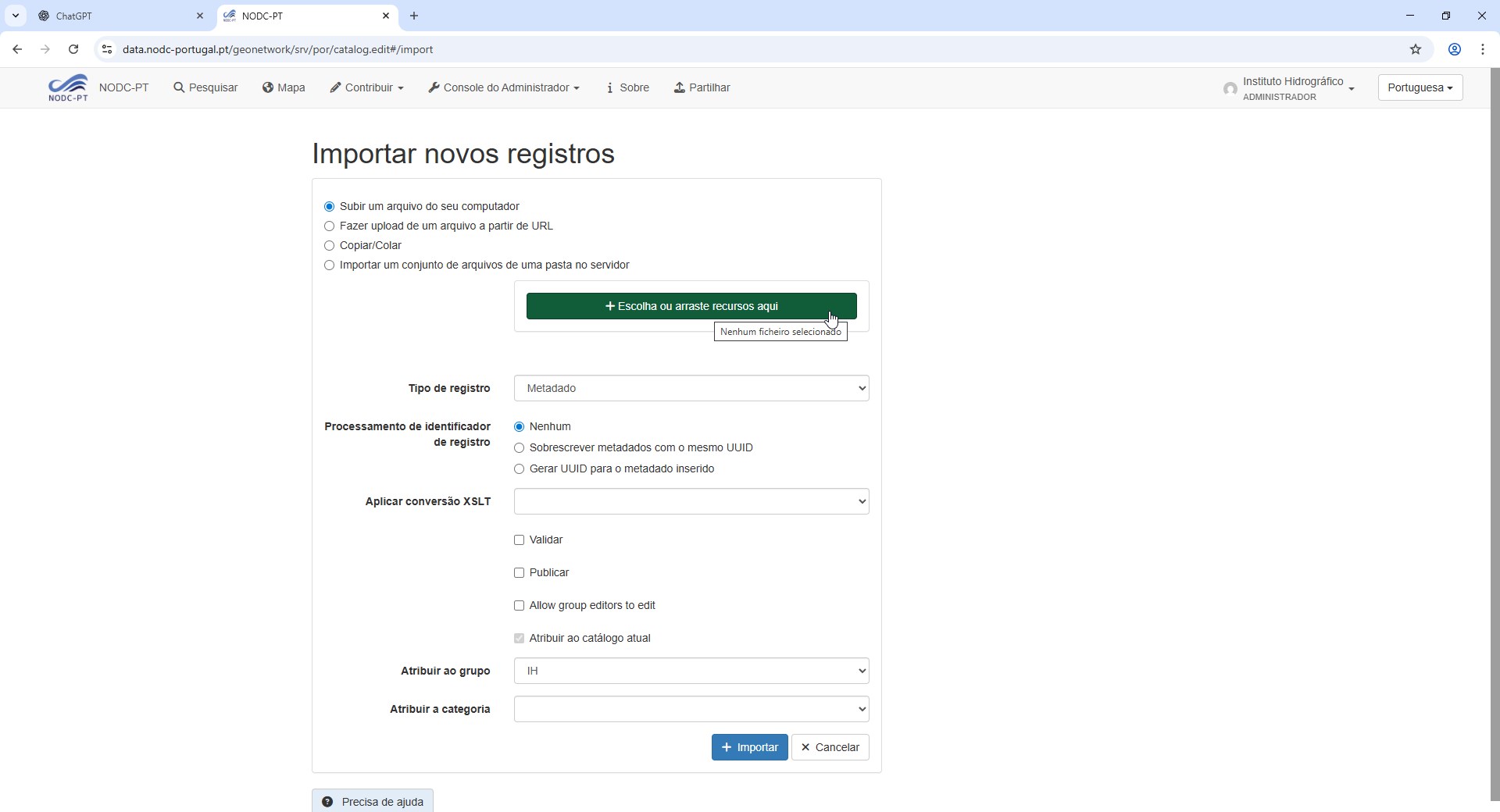 Quando os metadados são criados através do GeMA, o ficheiro XML gerado deve ser importado para o Catálogo de Metadados do NODC-PT. Por outro lado, quando os metadados são criados diretamente no Catálogo de Metadados do NODC-PT, não é necessária esta importação, uma vez que os metadados já se encontram na infraestrutura do NODC-PT, aguardando apenas a respetiva validação e publicação.