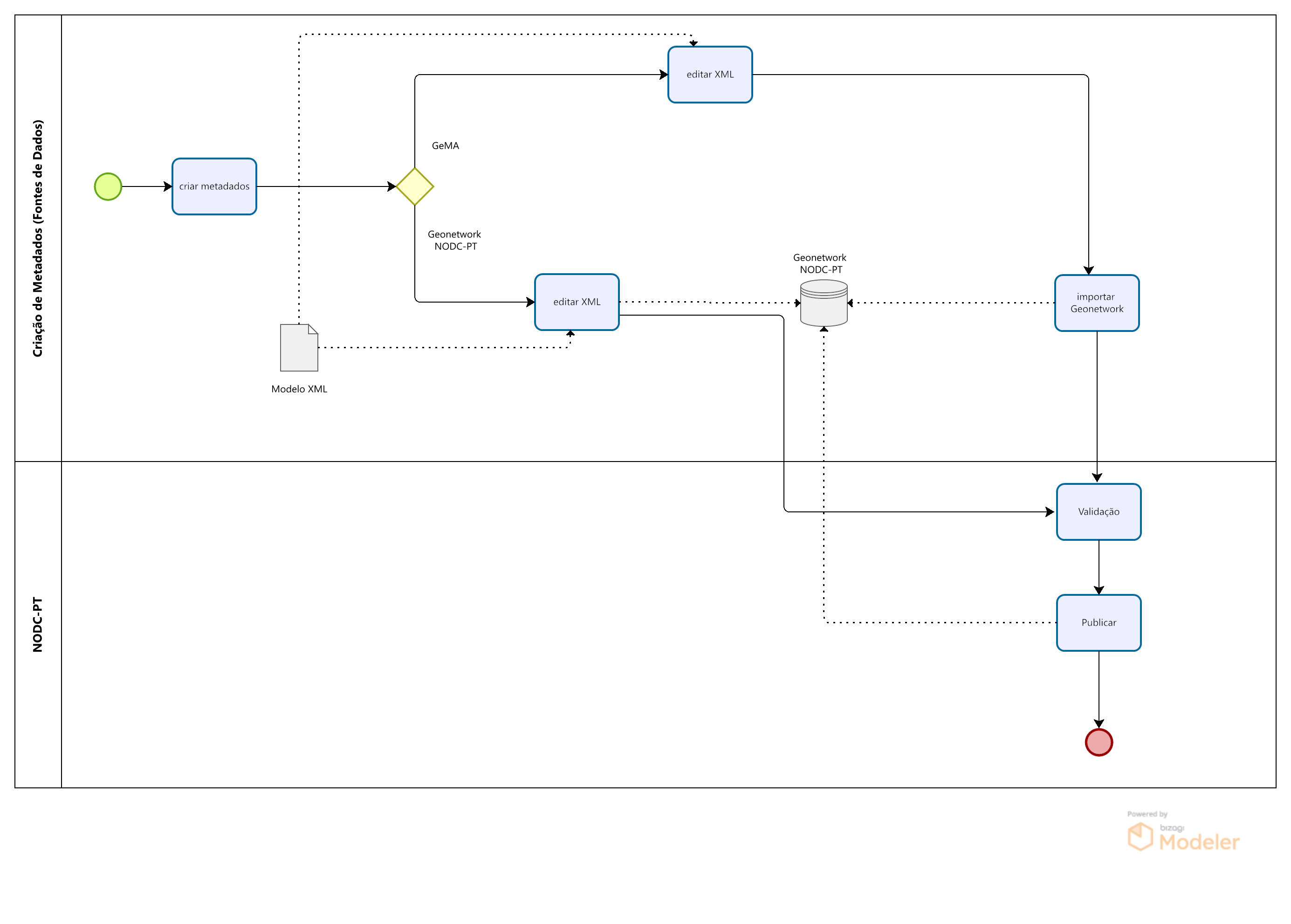 O diagrama infra esquematiza o processo de criação de metadados no GeMA  ou diretamente no Catálogo de Metadados do NODC-PT, na notação Business Process Model and Notation (BPMN).