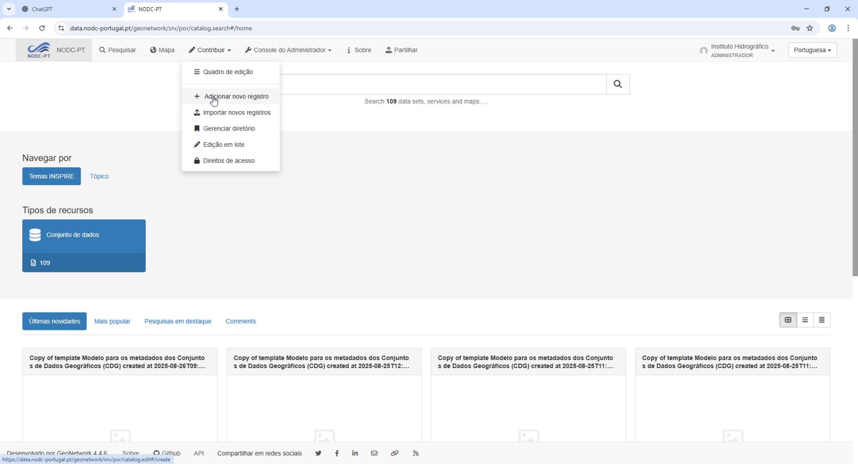 Aceda ao Catálogo de Metadados do NODC-PT com as credenciais apropriadas. Em seguida, localize e adicione o template de metadados previamente definido para a criação das fichas.