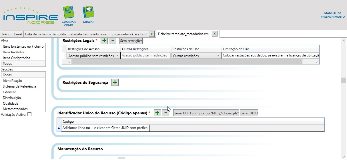 O modelo de metadados contém diversos campos com instruções breves sobre o tipo de informação a ser inserida em cada um deles (como "Escreva nome de contacto", "Coloque a data", etc.). Essas instruções servem apenas como orientação e devem ser apagadas no momento do preenchimento, sendo substituídas pela informação real e correspondente ao Conjunto de Dados Geográficos (CDG) que será submetido.